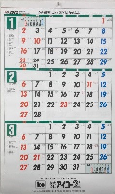 当社で年末年始に差し上げるカレンダーは人気があります。お取引の印刷会社さんから勧められて使うようになった三ヶ月カレンダーで、一般的にあまり流通していないようです。