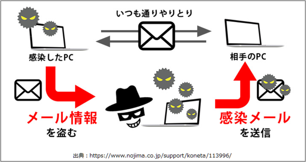 「Emotet」はWindowsOSの端末からアドレス帳、Eメールの送信履歴、IDやパスワードを盗み出したり、別のウイルスに感染しやすくするウイルスです。大切なお取引先のメールアドレスなどが流出すると先様にもご迷惑をお掛けすることになりますのでどうぞご注意下さい。