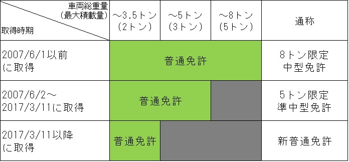 この免許を取得できたのは先の表の通り、2007/6/1までに取得した方ですので、1989/6/1までに生まれた方か、準中型免許(車両総重量7.5トン未満、最大積載量4.5トン未満)を別途取得された方に限定されます。