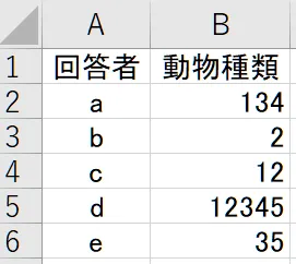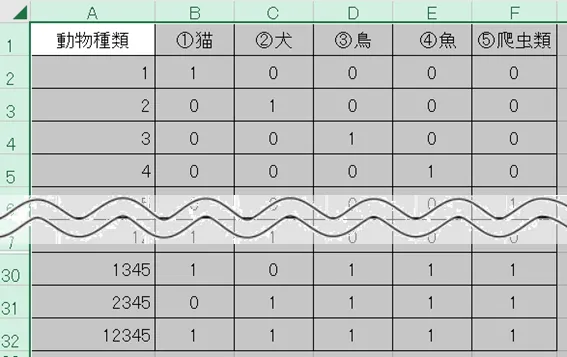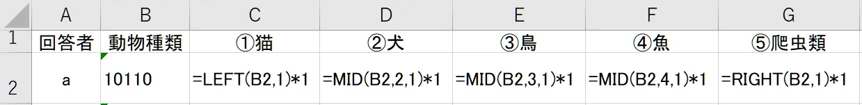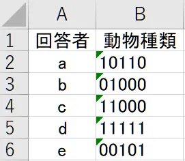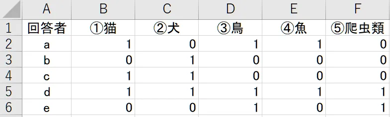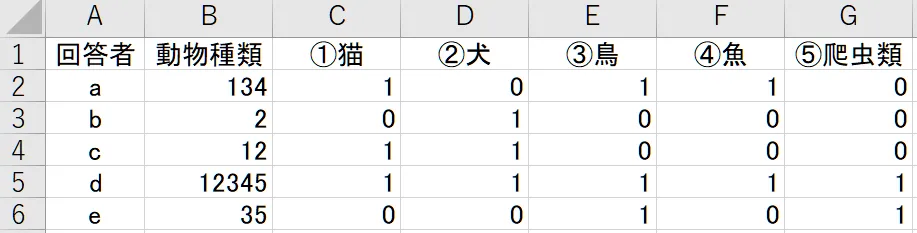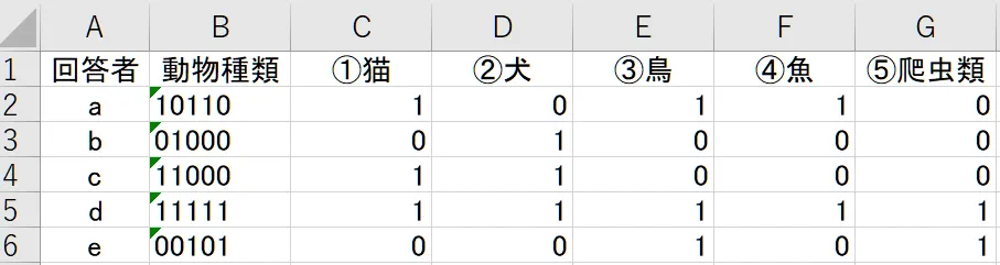 回答者aの場合(①猫③鳥④魚を選択)は「1→0→1→1→0」、回答者b(②犬を選択)は「0→1→0→0→0」(※→…キーボードの方向キー)と入力する方法で、いわば単純入力です。後の編集が不要というメリットがあります。