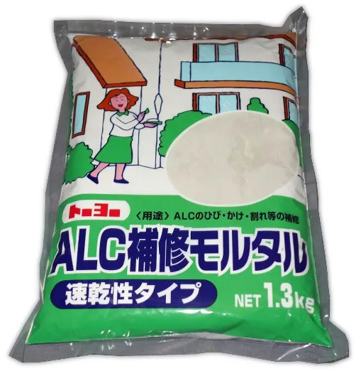 さて別の補修です。これは10年ほど前に行ったものですが、倉庫の壁にフォークリフトで誤って穴をあけられてしまい、直したものです。見栄えはよくありませんが、雨水の侵入は防げています。その際に用いた材料は、ALC補修材です。