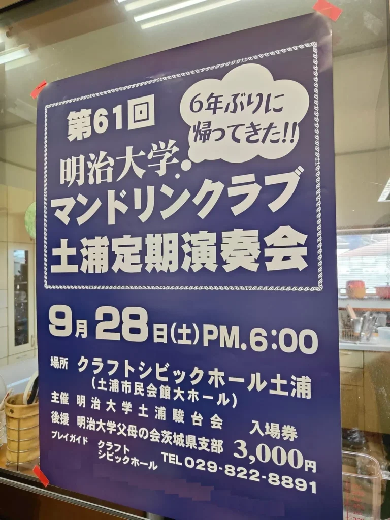 明治大学マンドリンクラブの演奏会が、今年は9/28(土)に土浦で開催されます。