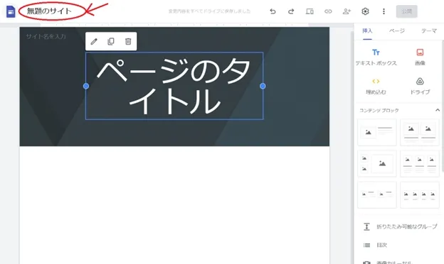 ③するとこのような画面になりますので、「無題のサイト」という部分を、任意のタイトルに書き換えます。これがこのサイトのGoogleドライブ上でのファイル名となります。
