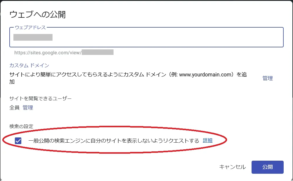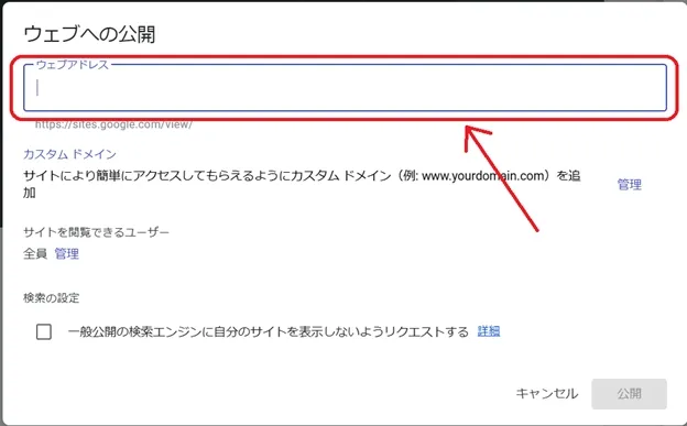右上の「公開」ボタンをクリックするとこのような画面が現れますので、「ウェブアドレス」の部分にURLの一部となる文字列を入力します。