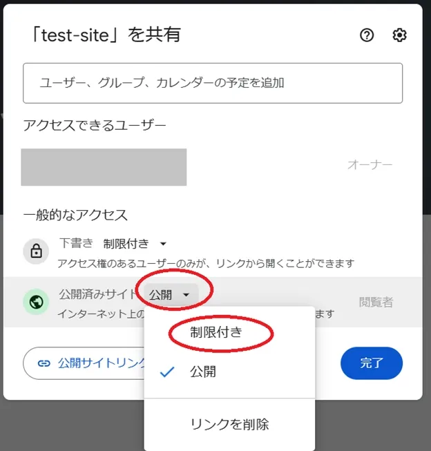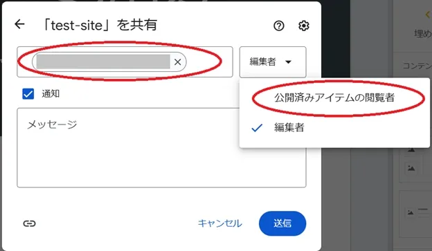 そして、この部分に、閲覧を許可するGoogleアカウントを入力し、「編集者」となっている部分を「公開済みアイテムの閲覧者」に変更して「送信」をクリックします。