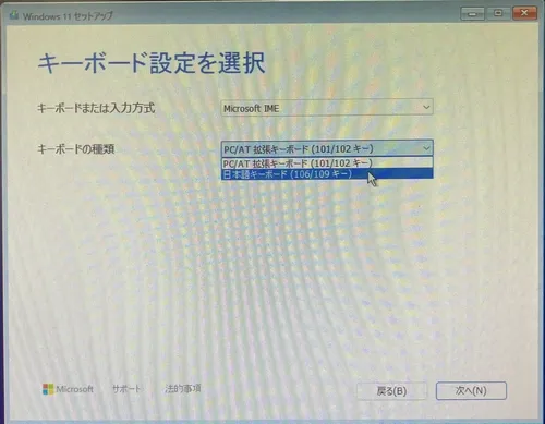 キーボードの種類は、「日本語キーボード(106/109キー)」