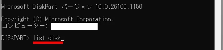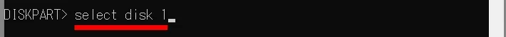 ⑤今回は「ディスク1」の方をフォーマットしますので、「select disk 1」と入力して「Enter」キーを押します。