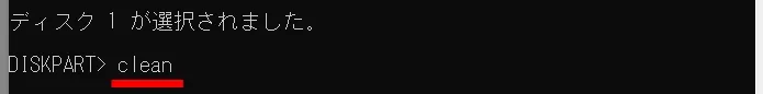 ⑥「clean」と入力して「Enter」キーを押すとフォーマットがはじまります。