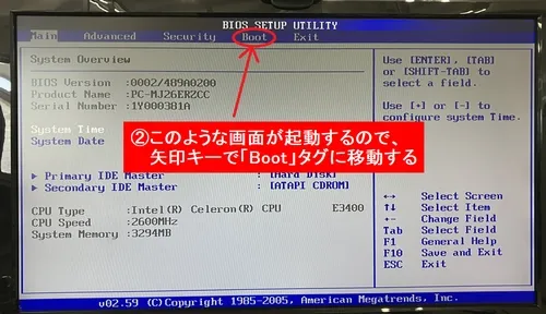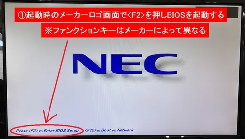 起動時のメーカーロゴ画面でF2キーを押す(連打する)ことで起動します。