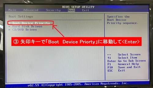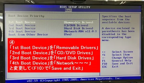 BIOSを起動してブートデバイスの最上位をUSBにします。