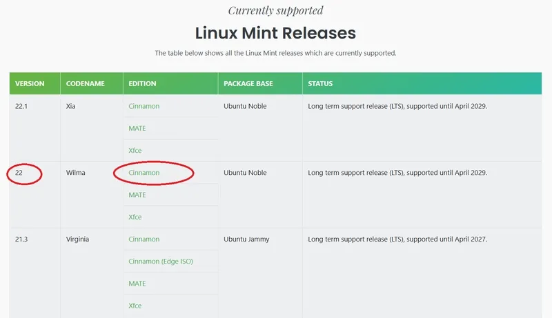 私が今回選択したバージョンは22.0。最新版は22.1ですが、今年1月にリリースされたばかりです。Linuxに限らず、最新のOSにはバグが潜んでいる可能性が高いので、リリースから日の浅いものは避けた方が良いと言われています。Windows11の最新バージョン24H2でも、リリース直後に大きなバグが報告されています。