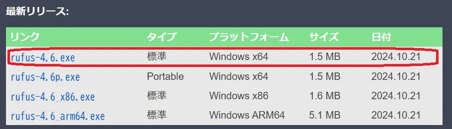今回はWindows11の端末で作りましたので、「rufus-4.6.exe 標準 Windows x64」を使いました。