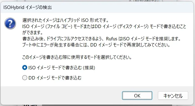 こちらで、「ISOイメージモードで書き込む(推奨)」を選択してOKをクリック。