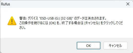 USBメモリの中身を消去するというメッセージです。「OK」で進みます。