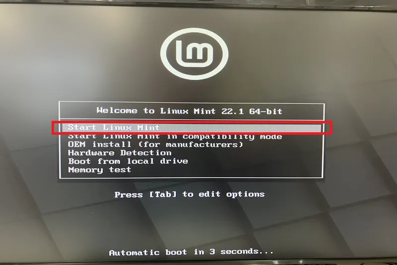 こちらが表示されたら「Start Linux Mint」を選択してEnter。