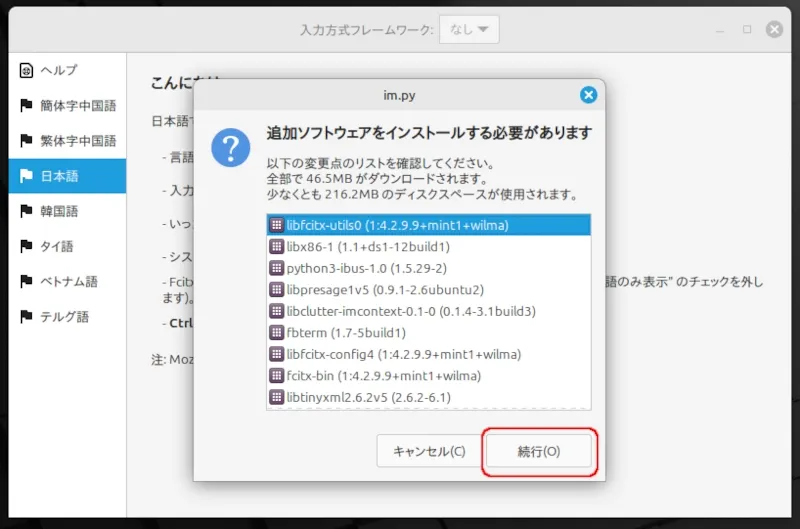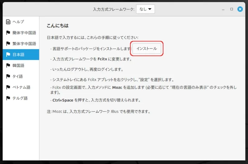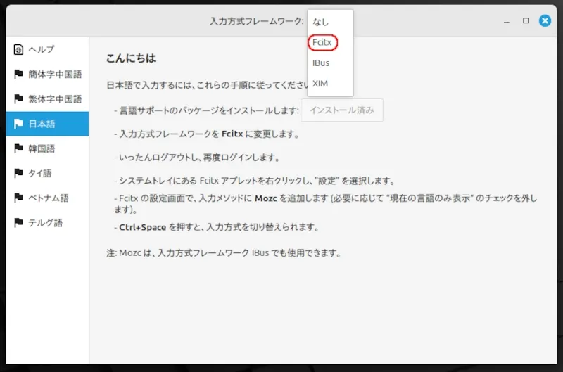 「入力方式フレームワーク」の右にある「なし▼」をクリックし、「Fcitx」を選択して画面を閉じてください。