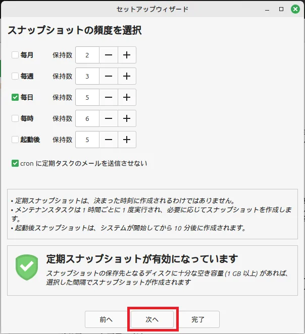 以下の設定内容は、毎日バックアップを行い、過去5世代のバックアップを残すという意味です。