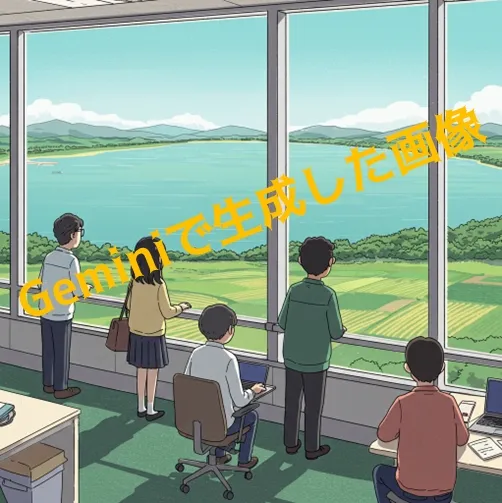 「オフィスから見える霞ヶ浦を眺める人々を描いてください」